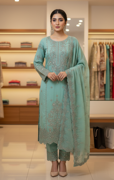 Embroidered Chiffon Dress – Elegant 3-Piece Party Wear