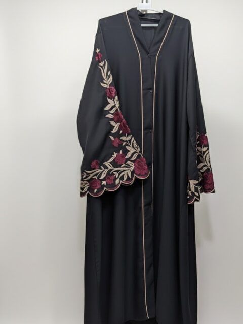 Premium Black Open Abaya with Burgundy Rose Embroidery & Scalloped Cuffs