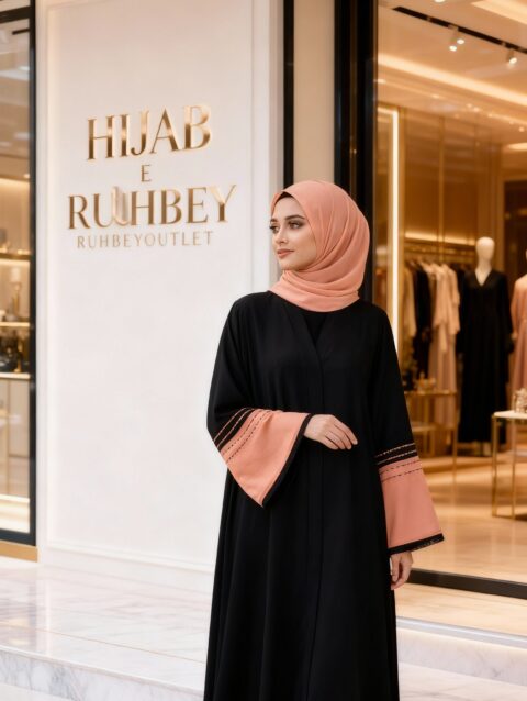 RUHBEY Premium Nida Fabric Abaya with neat embroidery work and DMC Stone Work & matching stoller— elegant and perfect for daily wear or special occasions.