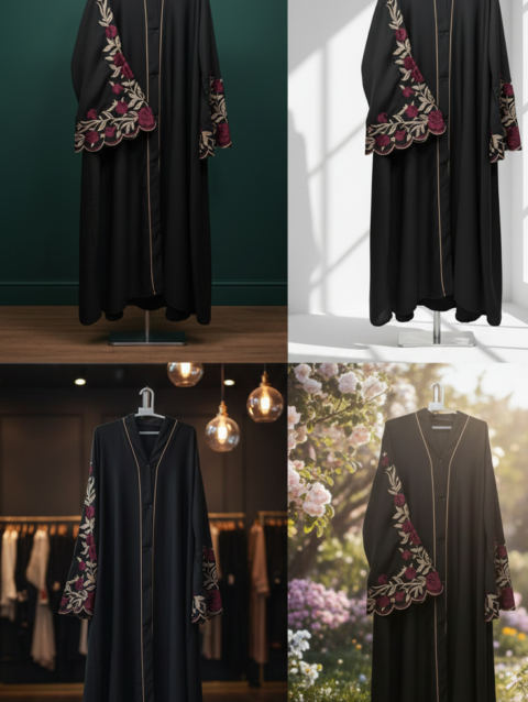 Premium Black Open Abaya with Burgundy Rose Embroidery & Scalloped Cuffs