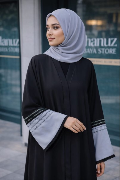 RUHBEY Premium Nida Fabric Abaya with neat embroidery work and DMC Stone Work & matching stoller— elegant and perfect for daily wear or special occasions.
