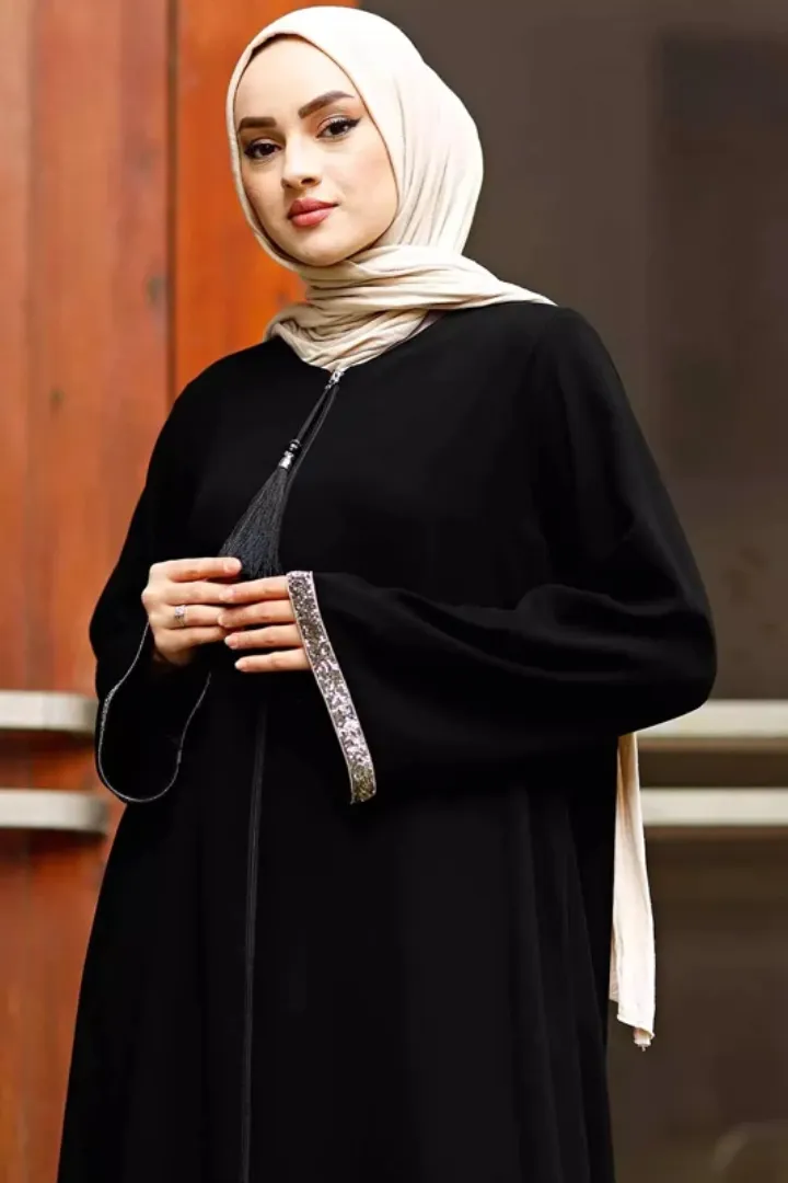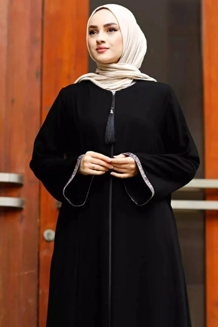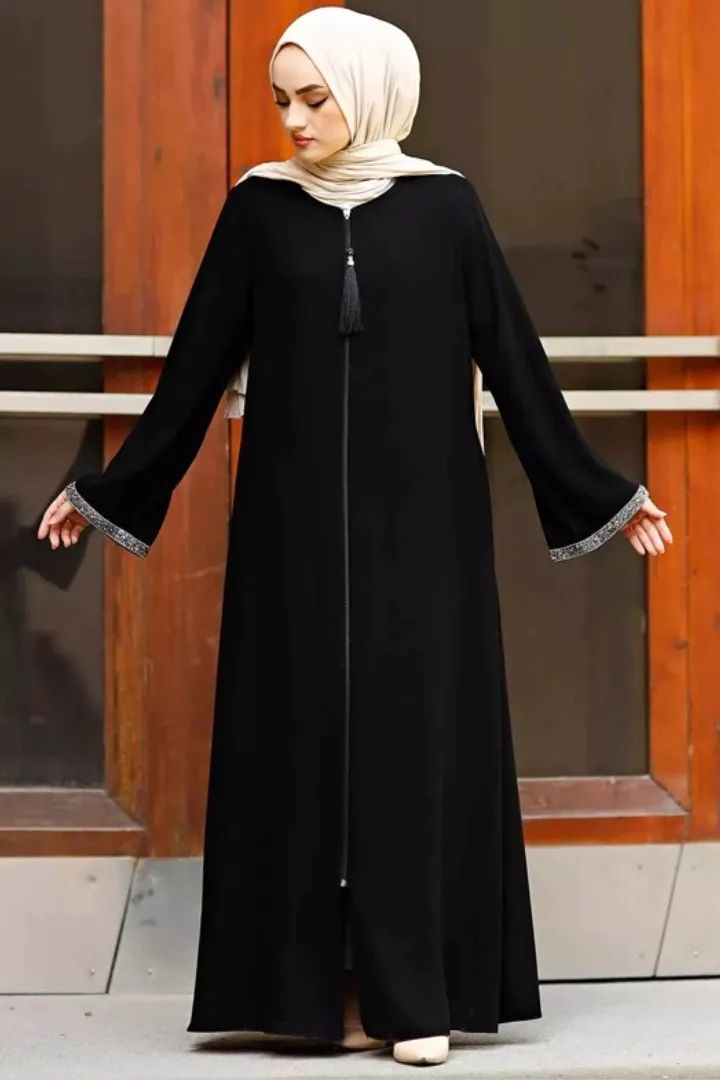 Q: What is the front style of this abaya? A: The front style of this abaya is a zipper, adding a modern touch to the traditional design.