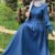 Stylish Fashionable Flare Design Denim Abaya With Pearls On Sleeves With Waist Belt