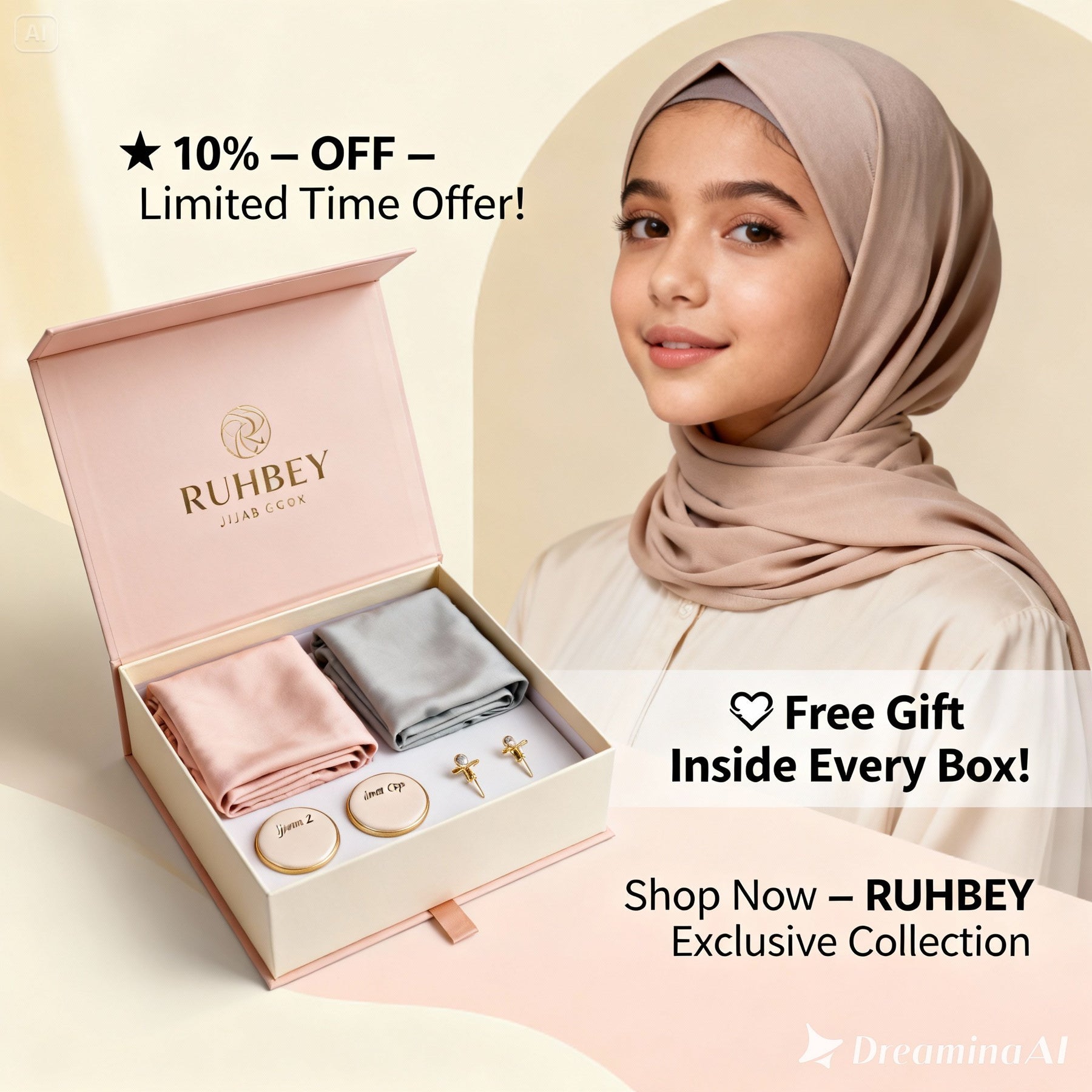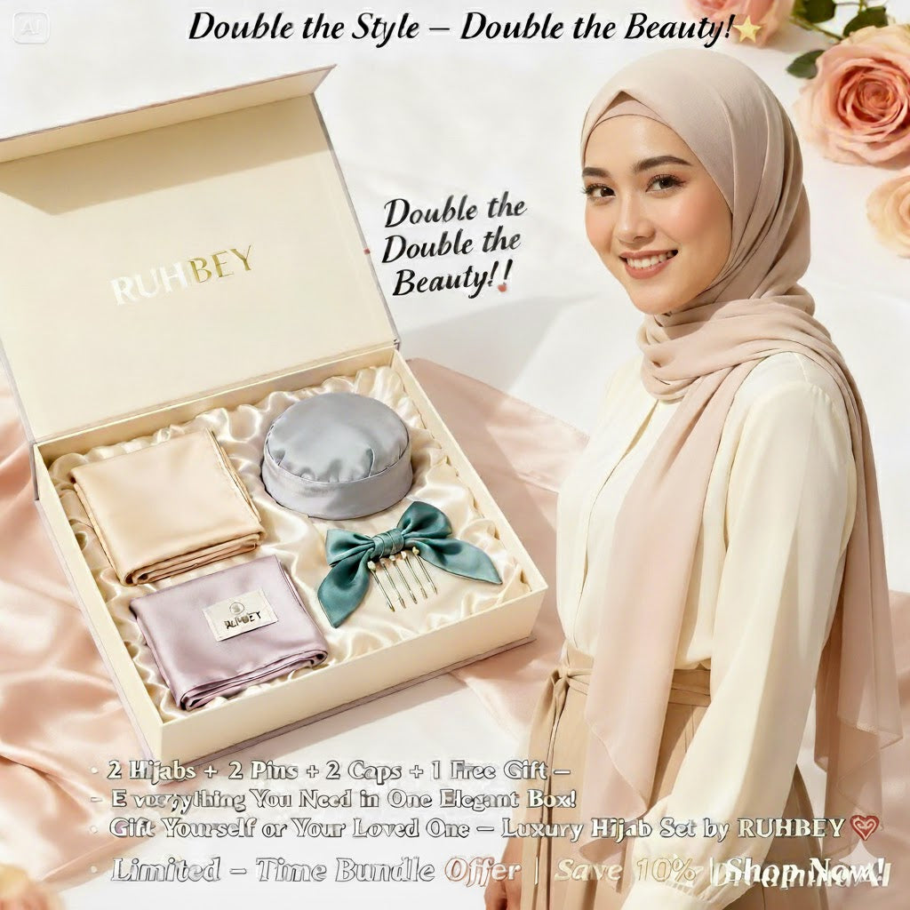 Wrap yourself in elegance with the RUHBEY Luxury Hijab Gift Box — a complete set made for everyday beauty and effortless style. Each box includes: ✨ 1 Georgette chiffon Hijab – soft, breathable, and perfectly draped. ✨ 1 Matching Cap – for a secure, comfortable fit all day. ✨ 1 Stylish Pin – adds a chic finishing touch. ✨ 1 Free Surprise Gift – a little extra love from RUHBEY 💝